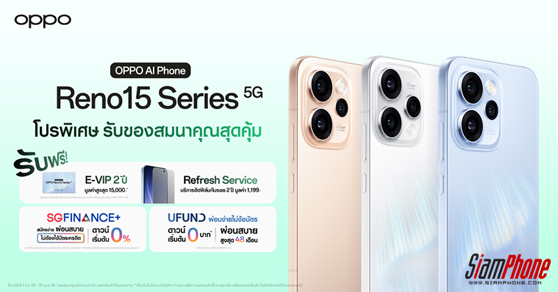 ลูกค้าที่ซื้อ OPPO Reno15 Series 5G ในช่วงวันที่ 1 มีนาคม 2569 ถึงวันที่ 30 เมษายน 2569 เตรียมพบกับข้อเสนอสุดพิเศษ รวมมูลค่าสูงสุด 16,199 บาท ดังนี้