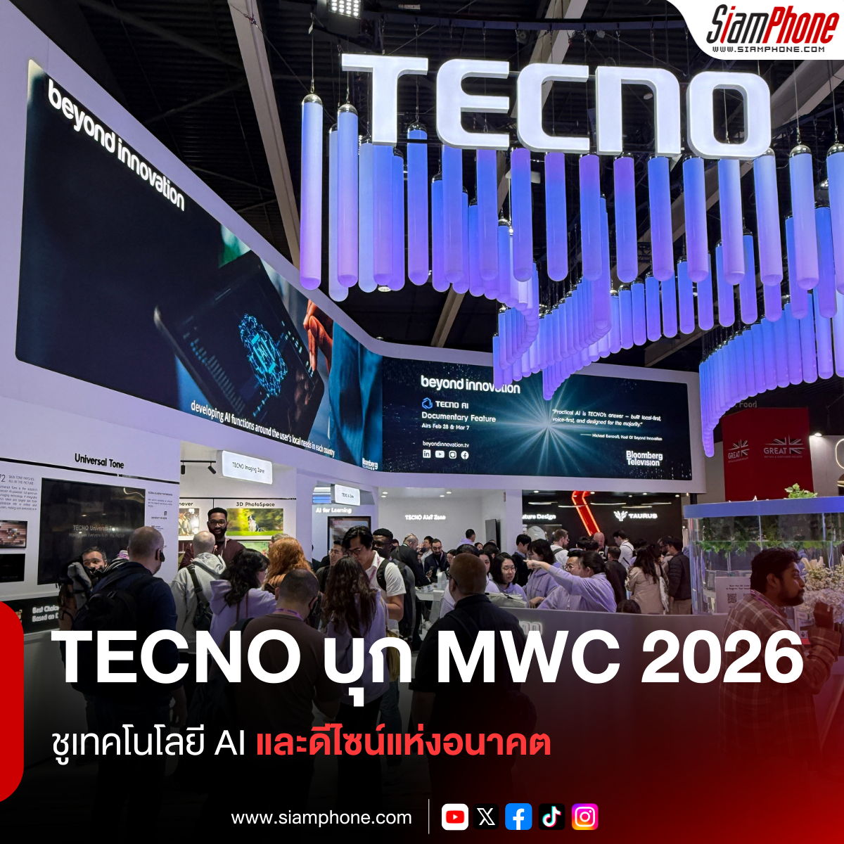 TECNO แบรนด์เทคโนโลยีระดับโลกตอกย้ำความเป็นผู้นำในยุค AI ด้วยการจัดแสดงนวัตกรรมประสบการณ์ วิศวกรรม และอุปกรณ์ต้นแบบ (Concept Device) กว่าสิบรายการในงาน Mobile World Congress (MWC) 2026 ภายใต้ธีม "Pioneering the Connection of Intelligence" (บุกเบิกการเชื่อมต่อแห่งอัจฉริยะ) การจัดแสดงครั้งนี้มุ่งเน้นไปที่การลดช่องว่างระหว่างขีดความสามารถทางเทคโนโลยีและการออกแบบที่คำนึงถึงมนุษย์เป็นศูนย์กลาง เพื่อสะท้อนภาพวิวัฒนาการของสมาร์ตโฟนและระบบนิเวศในอนาคต
