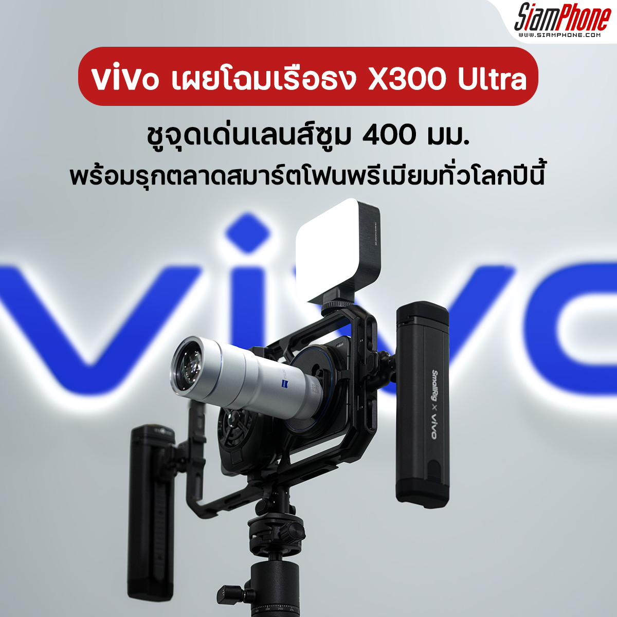 vivo เผยโฉมสมาร์ตโฟนเรือธงด้านการถ่ายภาพรุ่นใหม่ล่าสุด X300 Ultra เป็นครั้งแรกภายในงาน Mobile World Congress 2026 (MWC 2026) ซึ่งจัดขึ้นระหว่างวันที่ 2 – 5 มีนาคม 2569 ณ เมืองบาร์เซโลนา ประเทศสเปน โดยนำดีไซน์ตัวเครื่องมาจัดแสดงพร้อมชุดอุปกรณ์เสริมระดับโปรอย่างเลนส์ซูมระยะไกล 400mm Equivalent vivo ZEISS Telephoto Extender Gen 2 Ultra