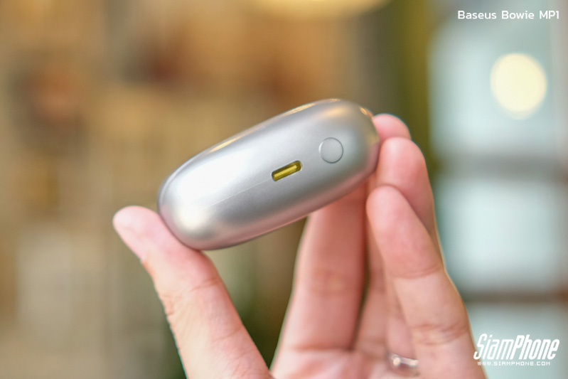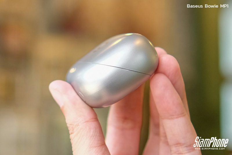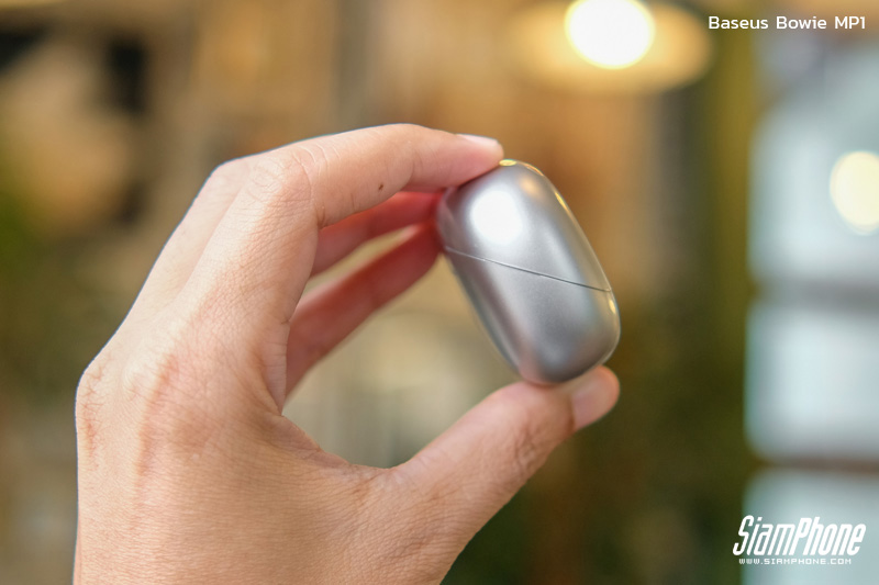 ตัวเคสชาร์จของ Baseus Bowie MP1 มาในรูปทรงสี่เหลี่ยมขอบโค้งมนให้ความรู้สึกมินิมอลและทันสมัยสุดๆ ผิวสัมผัสเป็นวัสดุแบบด้าน ซึ่งตัวที่ทาง Siamphone รีวิวจะเป็นสีไทเทเนียม Galaxy Natural Titanium ช่วยลดรอยนิ้วมือเวลาหยิบจับได้เป็นอย่างดี ขนาดของตัวเคสกะทัดรัดมากๆ มีขนาดเพียง 4.9 x 6.2 x 2.6 เซนติเมตร เมื่อวางบนฝ่ามือจะเห็นเลยว่ามีขนาดเล็กพอดีมือ น้ำหนักรวมตัวเครื่องก็เบาเพียง 50 กรัม ทำให้สามารถพกพาใส่กระเป๋าเสื้อหรือกระเป๋ากางเกงได้สบายๆ เลย