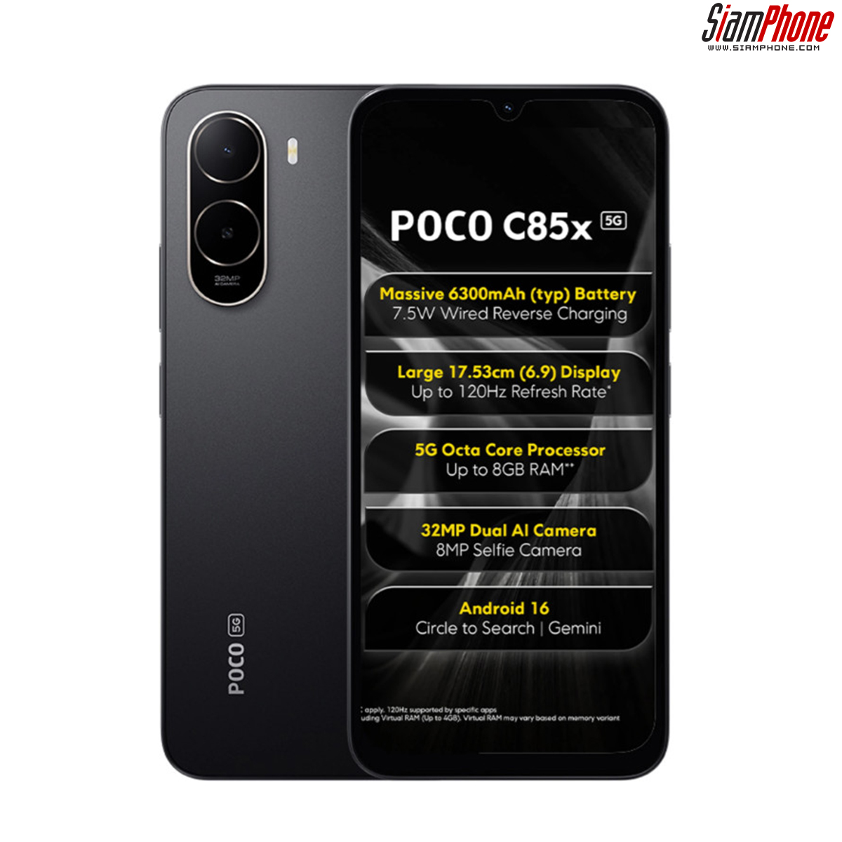 POCO C85X สมาร์ตโฟนซีรี่ย์เริ่มต้นรุ่นใหม่จากแบรนด์ POCO ถูกเปิดตัวอย่างเป็นทางการในประเทศอินเดีย มาพร้อมจุดเด่นหน้าจอแสดงผล LCD กว้าง 6.9 นิ้ว ความละเอียด HD+ ปรับความสว่างได้สูงสุด 810nits อัตรา Refresh Rate สูงสุด 120Hz และยังได้มาตรฐานหน้าจอถนอมสายตาจาก TÜV Rheinland ทั้งแสงสีฟ้า และ Flicker Free นอกจากนี้ยังโดดเด่นด้วยแบตเตอรี่ขนาดใหญ่ 6300mAh ใช้งานดูวิดีโอติดต่อกันได้ 35+ ชั่วโมง สนับสนุนชาร์จเร็วผ่านสาย 15W