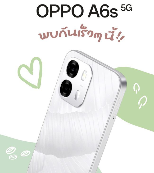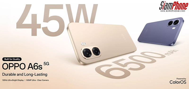 OPPO A6s 5G สมาร์ตโฟน 5G ระดับเริ่มต้นรุ่นใหม่จากแบรนด์ OPPO ถูกเปิดตัวอย่างเป็นทางการในประเทศอินเดีย มีความโดดเด่นด้วยแบตเตอรี่ขนาดใหญ่ 6500mAh สนับสนุนชาร์จเร็วผ่านสาย 45W ได้กล้องหลังคู่ ความละเอียด 50+2MP ไม่พอแค่นั้นยังมีหน้าจอแสดงผลกว้าง 6.75 นิ้ว ความละเอียด HD+ และมีอัตรา Refresh Rate สูงสุด 120Hz