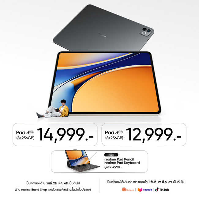 ในตอนนี้ realme Pad 3 ได้วางขายในประเทศไทยอย่างเป็นทางการ มีให้เลือกสีเดียวคือ Space Grey สนนราคาเริ่มต้น 12,999 บาท รับฟรี! realme Pad Pencil + realme Pad Keyboard เริ่มวางขายทางออนไลน์ตั้วแต่วันที่ 19 มี.ค. 69 เป็นต้นไป และทางหน้าร้านวันที่ 28 มี.ค. 69 เป็นต้นไป