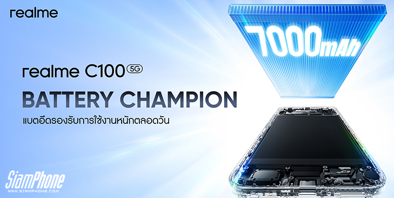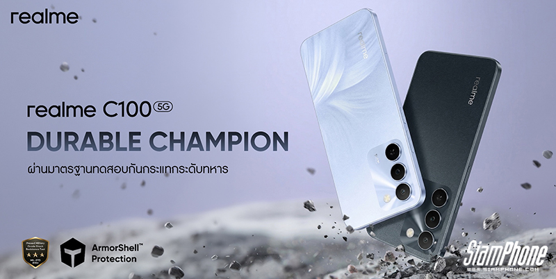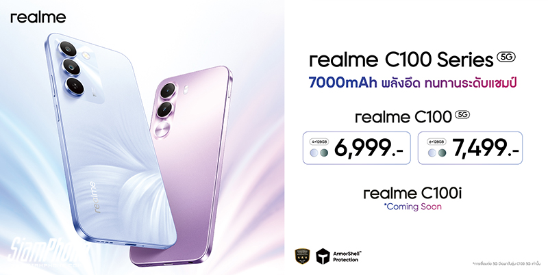 realme (เรียลมี) ประกาศเปิดตัวสมาร์ตโฟนสองรุ่นใหม่ใน C100 Series ทั้ง “realme C100 5G” และ “realme C100i” ที่ถูกพัฒนามาเพื่อสร้างมาตรฐานใหม่ในตลาดสมาร์ตโฟนระดับเริ่มต้น มาพร้อมกับสโลแกน “พลังอึด ทนทานระดับแชมป์” โดยเป็นสมาร์ทโฟนประสิทธิภาพสูงที่คุ้มค่าเกินราคาสุดๆ ด้วยแบตเตอรี่ยักษ์แบบ Titan ความจุ 7000mAh ที่ออกแบบให้ยืนระยะนานถึง 6 ปี พร้อมปกป้องตัวเครื่องด้วยมาตรฐานระดับทหาร และฟีเจอร์ AI ที่พบเฉพาะในรุ่นเรือธง ซึ่งผู้ใช้จะได้ฟีเจอร์ทั้งหมดนี้ในราคาหลักพันเท่านั้น! โดยเฉพาะรุ่นใหญ่อย่าง C100 5G จะเน้นที่ประสิทธิภาพและความสามารถของเครือข่าย 5G เต็มรูปแบบ ส่วนรุ่นน้องอย่าง C100i ตอบโจทย์ผู้ใช้งานที่ต้องการฟีเจอร์ครบครันในราคาที่เข้าถึงได้ยิ่งขึ้น