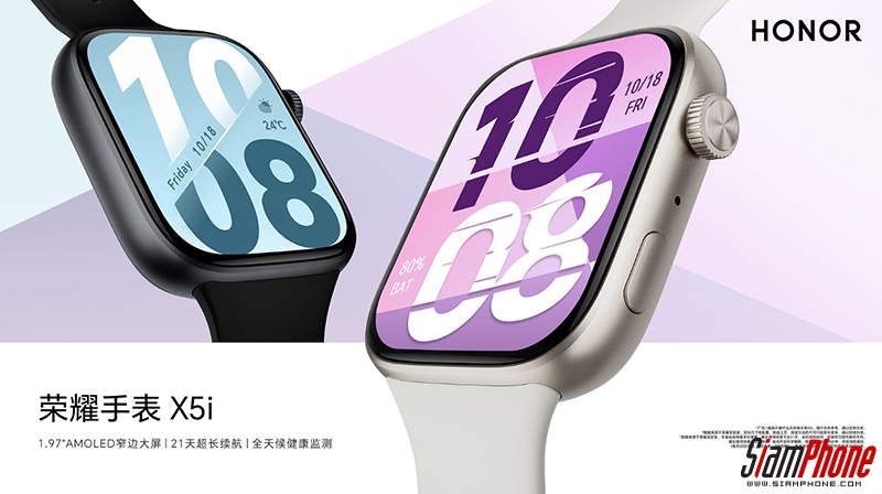 HONOR Watch X5i สมาร์ตวอทช์รุ่นใหม่จากแบรนด์ HONOR ถูกเปิดตัวอย่างเป็นทางการในประเทศจีน โดยเป็นสมาร์ตวอทช์ทรงสี่เหลี่ยม มีแป้นหมุนทางขวามือ ดูแล้วหน้าตาคุ้นๆ เหมือนค่ายผลไม้ แต่มีความเบาเพียง 28 กรัม ความบางเพียง 10.9 มิลลิเมตร มีความแข็งแกร่งด้วยเฟรมกลางวัสดุ Metallic และได้มาตรฐานกันน้ำลึก 1ATM เท่านั้น ทำให้กันน้ำได้เล็กน้อยเท่านั้น (ไม่เหมาะกับใส่ดำน้ำ หรือดำน้ำ) ส่วนสายรัดข้อมือถอดใส่ง่ายๆ เพราะเป็นแบบ Quick Release