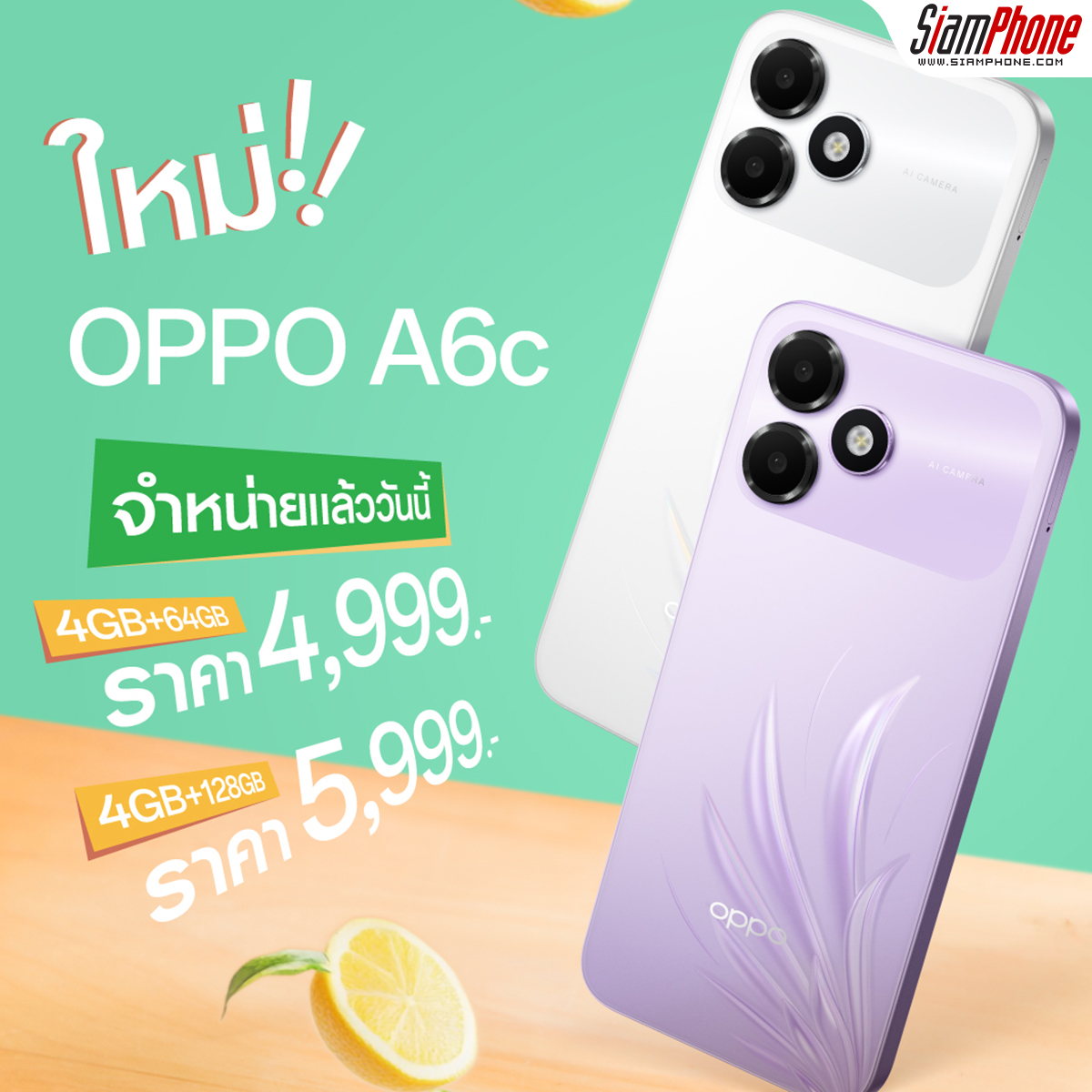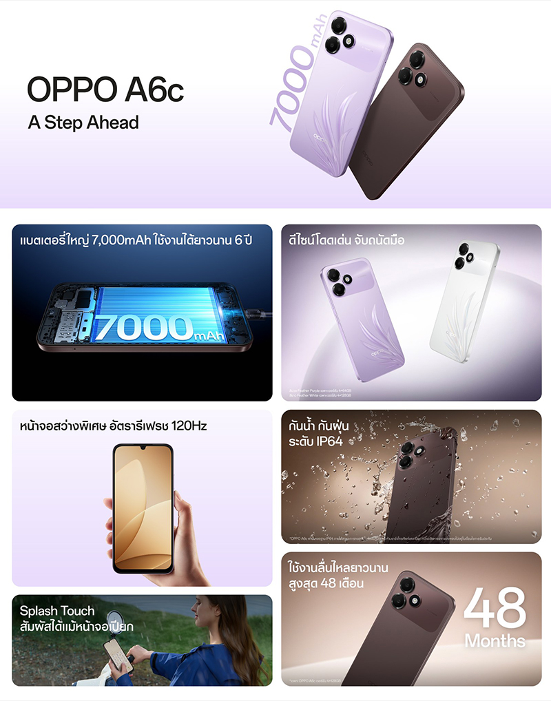 OPPO A6c สมาร์ตโฟนที่มาพร้อมความทนทานเพื่อมอบประสบการณ์การใช้งานที่ยาวนาน และครอบคลุมทุกการใช้งาน ด้วยแบตเตอร์รี่ขนาดใหญ่ 7,000mAh อายุแบตเตอรี่ใช้งานได้ยาวนาน 6 ปี และไม่หวั่นทุกสถานการณ์ด้วยความทนทานมาตรฐานกันน้ำกันฝุ่นระดับ IP64 พร้อมกับดีไซน์โดดเด่นอย่างมีสไตล์ น้ำหนักเบา พกพาสะดวก จับถนัดมือ พร้อมมอบประสบการณ์การใช้งานสุดลื่นไหล ไม่มีสะดุด ด้วยหน้าจอสว่างพิเศษอัตรารีเฟรช 120Hz มาใน 2 ความจุ ได้แก่ OPPO A6c (4+64GB) ในราคาเพียง 4,999 บาท ซึ่งวางจำหน่ายใน 2 สีได้แก่ สีม่วง Feather Purple และสีน้ำตาล Stone Brown และ OPPO A6c (4+128GB) ในราคาเพียง 5,999 บาท วางจำหน่าย 2 สี ได้แก่ สีขาว Feather White และสีน้ำตาล Stone Brown