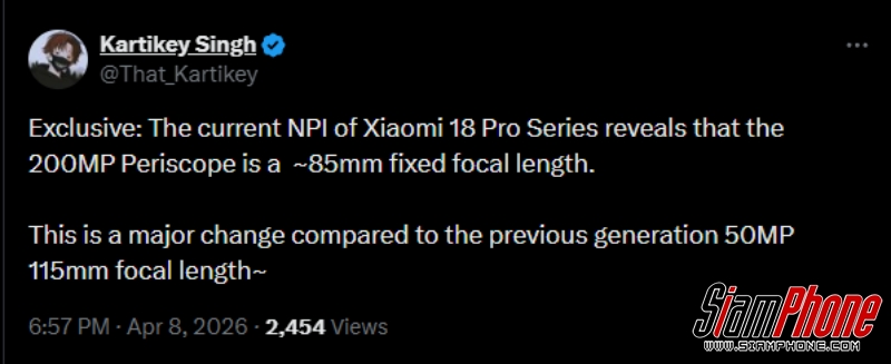 จากข้อมูลของแหล่งข่าวหลุดระบุว่า Xiaomi 18 Pro และ 18 Pro Max จะได้รับการติดตั้งเลนส์ Periscope Telephoto ตัวใหม่ที่มีความละเอียดสูงถึง 200MP ซึ่งจะมาพร้อมกับระยะเลนส์ (Focal Length) ที่ 85mm