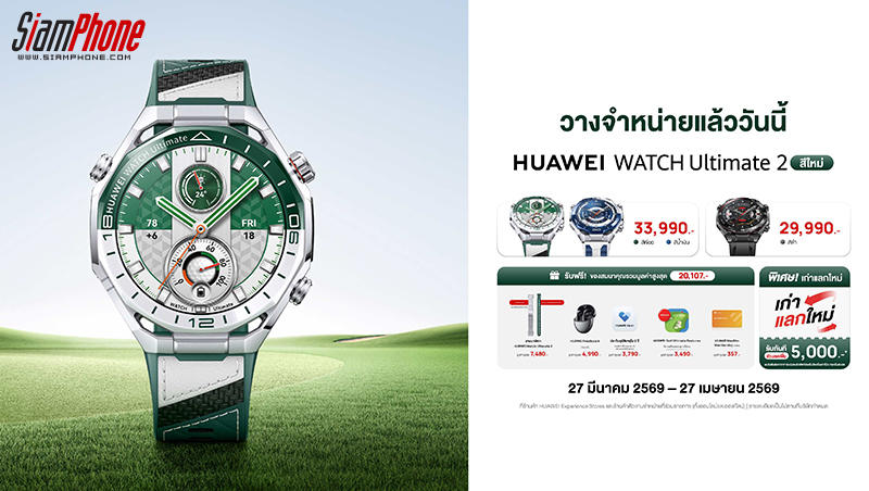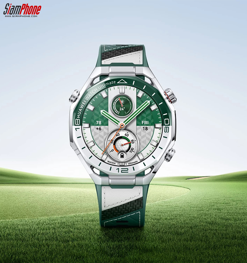 HUAWEI WATCH Ultimate 2 Green Edition สมาร์ทวอทช์ที่ออกแบบมาเพื่อนักกอล์ฟและสายแอดเวนเจอร์โดยเฉพาะ โดดเด่นด้วยดีไซน์ขอบหน้าปัดเซรามิกนาโนคริสตัลสองสี (เขียว-ขาว) และตัวเรือนโลหะเหลวผสมเซอร์โคเนียม หน้าจอ LTPO 2.0 สว่างสูงสุด 3,500 nits จัดเต็มด้วยโหมดกอล์ฟที่อัปเกรดใหม่ ทั้งการวัดระยะแบ็คสวิง, ฟีเจอร์ Custom Green Flagstick ปรับตำแหน่งธงบนกรีนได้เอง, Auto-rotating Greens View และแผนที่สนามกอล์ฟกว่า 17,000 แห่งทั่วโลก นอกจากนี้ยังรองรับการดำน้ำลึกถึง 150 เมตร มีระบบโซนาร์สื่อสารใต้น้ำ2 และแบตเตอรี่สุดอึดใช้งานได้นานสูงสุด 6 วัน