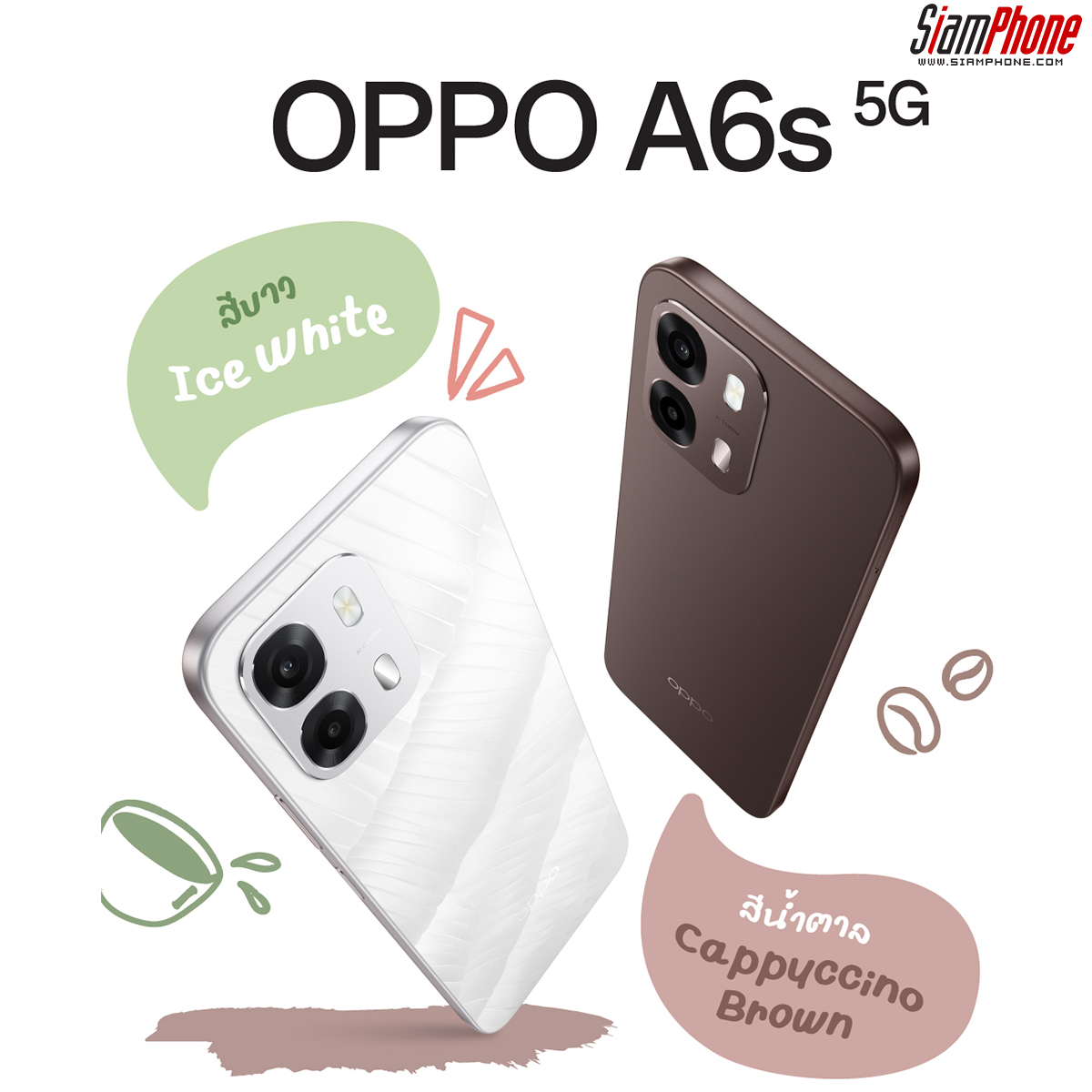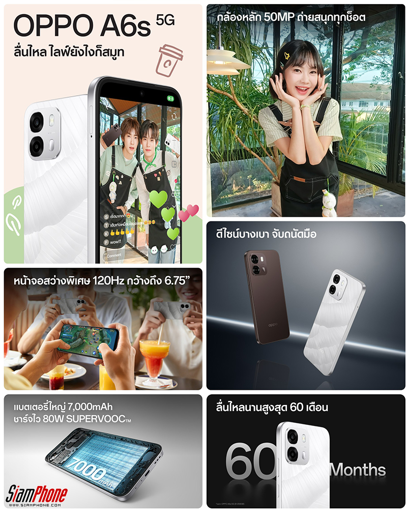 OPPO A6s 5G สมาร์ตโฟนดีไซน์สวย บางเบา จับถนัดมือ พร้อมกล้องคมชัดพิเศษ ถ่ายสนุก ใช้งานสมูทลื่นไหล มาพร้อมกับ 2 สีใหม่ ได้แก่ สีขาว Ice White และสีน้ำตาล Cappuccino Brown พร้อมหน้าจอแสดงผล LCD กว้างขนาด 6.75 นิ้ว และกล้องคมชัดพิเศษ 50MP ถ่ายสนุก ทุกช็อต พร้อมมอบประสบการณ์การใช้งานสุดลื่นไหล ไม่มีสะดุด ด้วยหน้าจออัตรารีเฟรช 120Hz และ ColorOS ที่อัปเกรดยกระดับความราบรื่นไร้รอยต่อ ด้านแบตเตอรี่ขนาดใหญ่ถึง 7,000mAh รับประกันใช้งานนานกว่า 5 ปี และชาร์จไว 80W SUPERVOOC