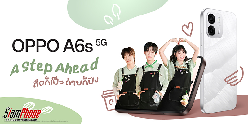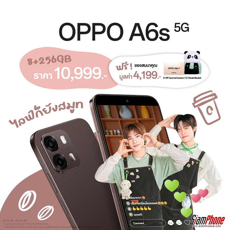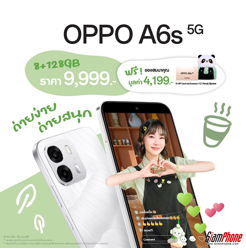 OPPO A6s 5G รุ่นใหม่ล่าสุดจากตระกูลซีรีส์ A ที่มาภายใต้สโลแกน “A Step Ahead” สมาร์ตโฟนเพื่อนคู่ใจ ตอบโจทย์ทุกการใช้งาน มาพร้อม 2 ความจุ ได้แก่ OPPO A6s 5G (8+128GB) ในราคาเพียง 9,999 บาท และ OPPO A6s 5G (8+256GB) ในราคาเพียง 10,999 บาท พิเศษยิ่งกว่านั้น เมื่อซื้อภายในวันนี้ ถึง 30 เมษายน 2569 นี้ จะได้รับประกันจอแตก จํานวน 1 ครั้ง ภายในระยะเวลา 1 ปี (นับจากวันที่ซื้อเครื่อง) และ Panda Blanket จำนวน 1 ผืนมูลค่า 1,199 บาท