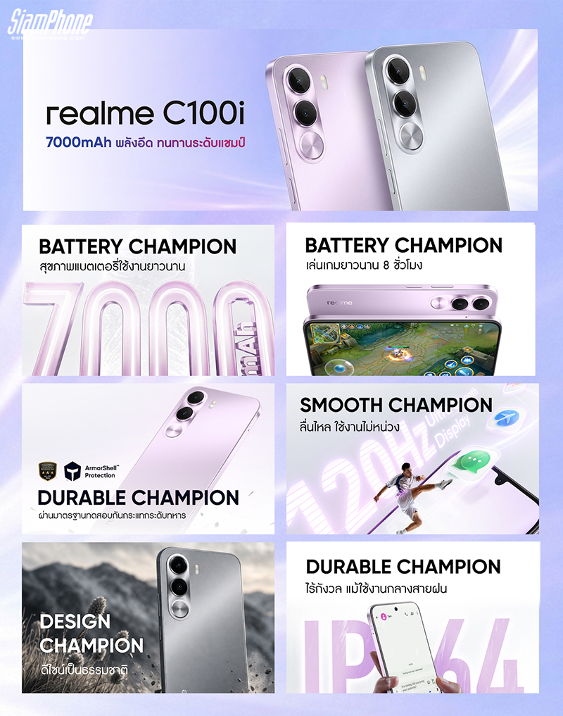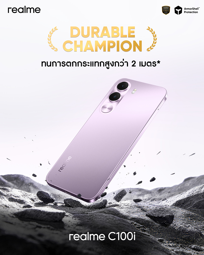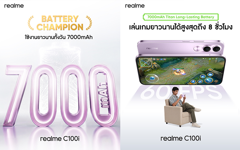 realme เปิดราคา realme C100i สมาร์ตโฟนระดับเริ่มต้นสายอึดอย่างเป็นทางการในราคา 4,999 บาท ชูคอนเซ็ปต์ “7000mAh พลังอึด ทนทานระดับแชมป์” อัดฟีเจอร์ระดับพรีเมียมเต็มอัตรา มอบประสิทธิภาพเกินราคา เพื่อสร้างมาตรฐานใหม่ของมือถือหลักพันสู่อุตสาหกรรมสมาร์ตโฟน!