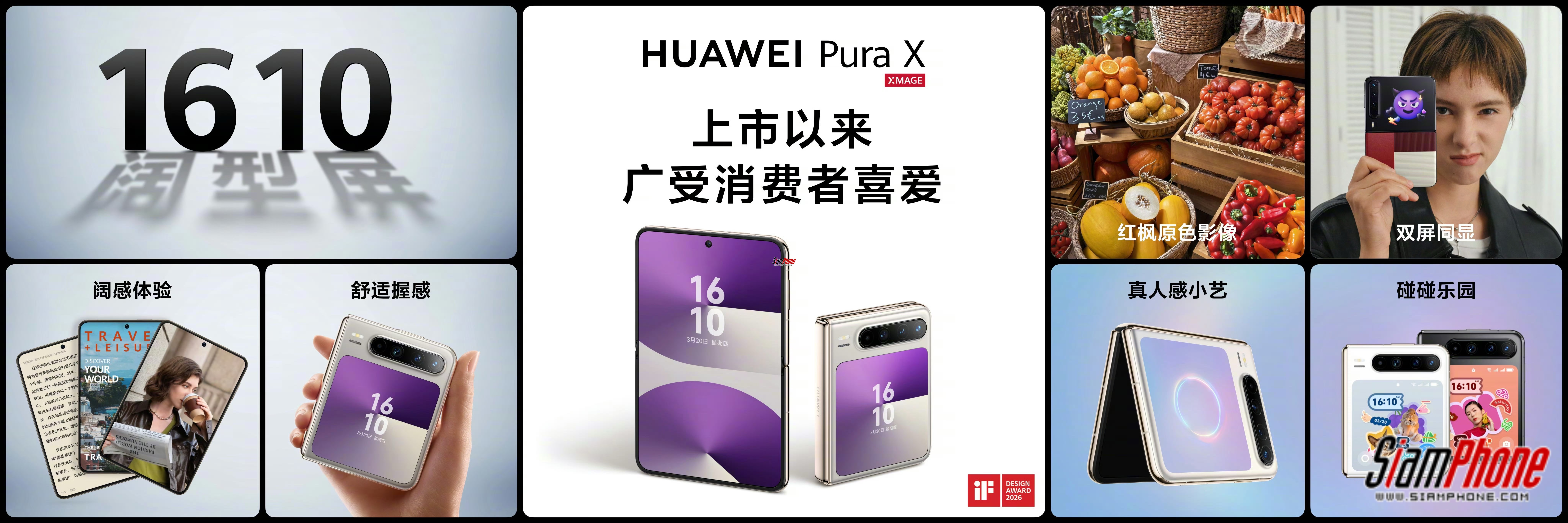 HUAWEI ประกาศเปิดตัว "HUAWEI Pura X Max" อย่างเป็นทางการ โดยชูจุดเด่นในฐานะสมาร์ตโฟนหน้าจอพับแบบแนวนอน (Horizontally foldable) รุ่นแรกของอุตสาหกรรม ตัวเครื่องมาพร้อมดีไซน์แบบเรขาคณิตที่ดูทันสมัย บริเวณขอบโมดูลกล้องตกแต่งด้วยวัสดุเซรามิกเพิ่มความหรูหรา โดยมีให้เลือกถึง 5 สี ได้แก่ สีดำ Midnight Black, สีขาว Zero White, สีน้ำเงิน Interstellar Blue, สีทอง Olive Gold และสีส้ม Vibrant Orange