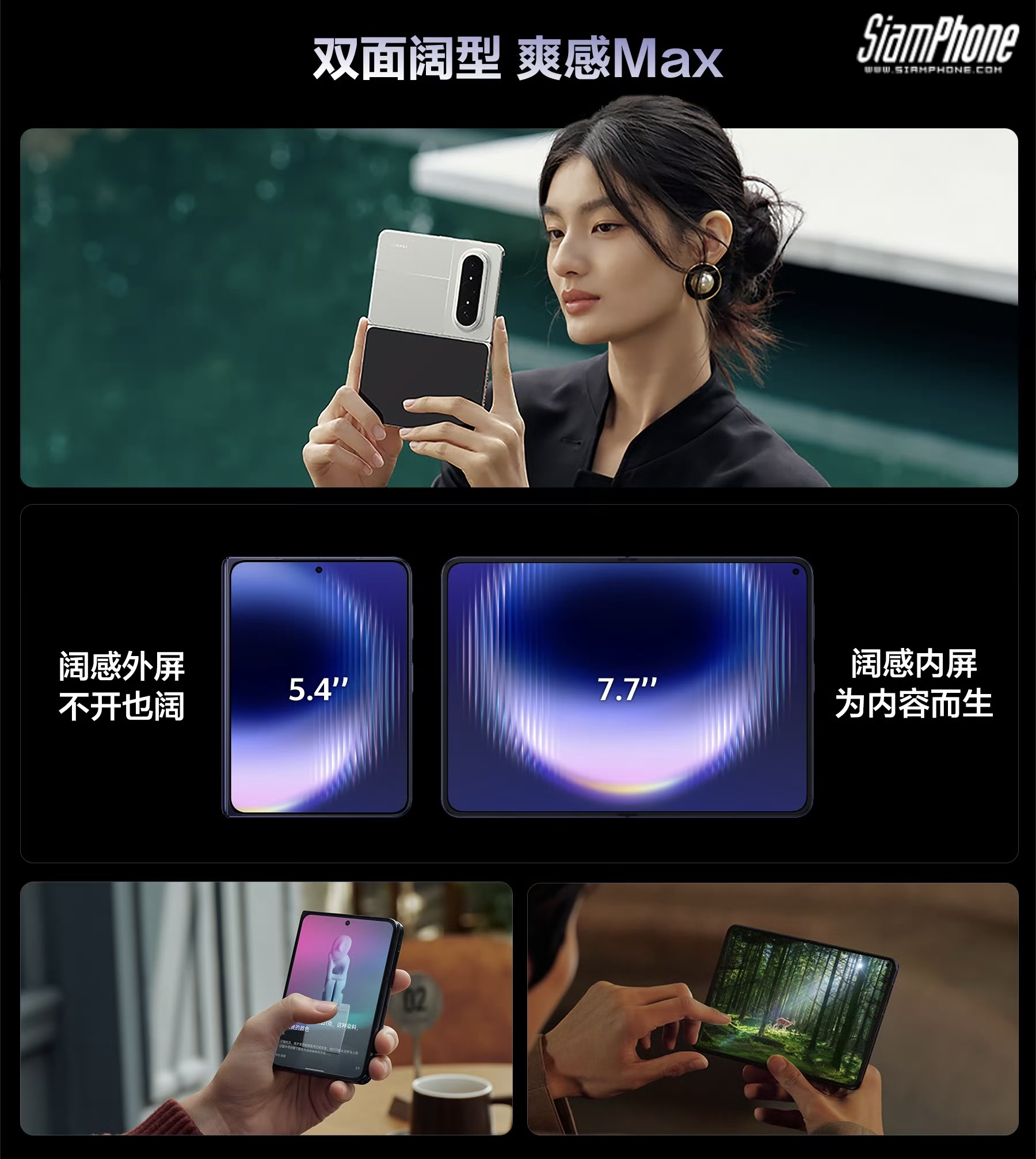 จุดเด่นสำคัญของรุ่นนี้อยู่ที่หน้าจอแบบคู่ที่มีอัตราส่วนแสดงผลแบบ 2:1 ซึ่งออกแบบมาเพื่อให้ประสบการณ์การมองเห็นที่ต่อเนื่องเวลาสลับการใช้งานระหว่างสองจอ โดยหน้าจอด้านนอกมีขนาด 5.4 นิ้ว ให้ความสว่างสูงสุดถึง 3,500nits ขณะที่หน้าจอด้านในเมื่อกางออกจะมีขนาด 7.7 นิ้ว ความสว่าง 3,000nits ซึ่งทั้งสองจอใช้พาเนล OLED พร้อมเทคโนโลยี LTPO 2.0 รองรับอัตรารีเฟรชเรทปรับอัตโนมัติ 1-120Hz เพื่อความลื่นไหลระดับสูงสุด