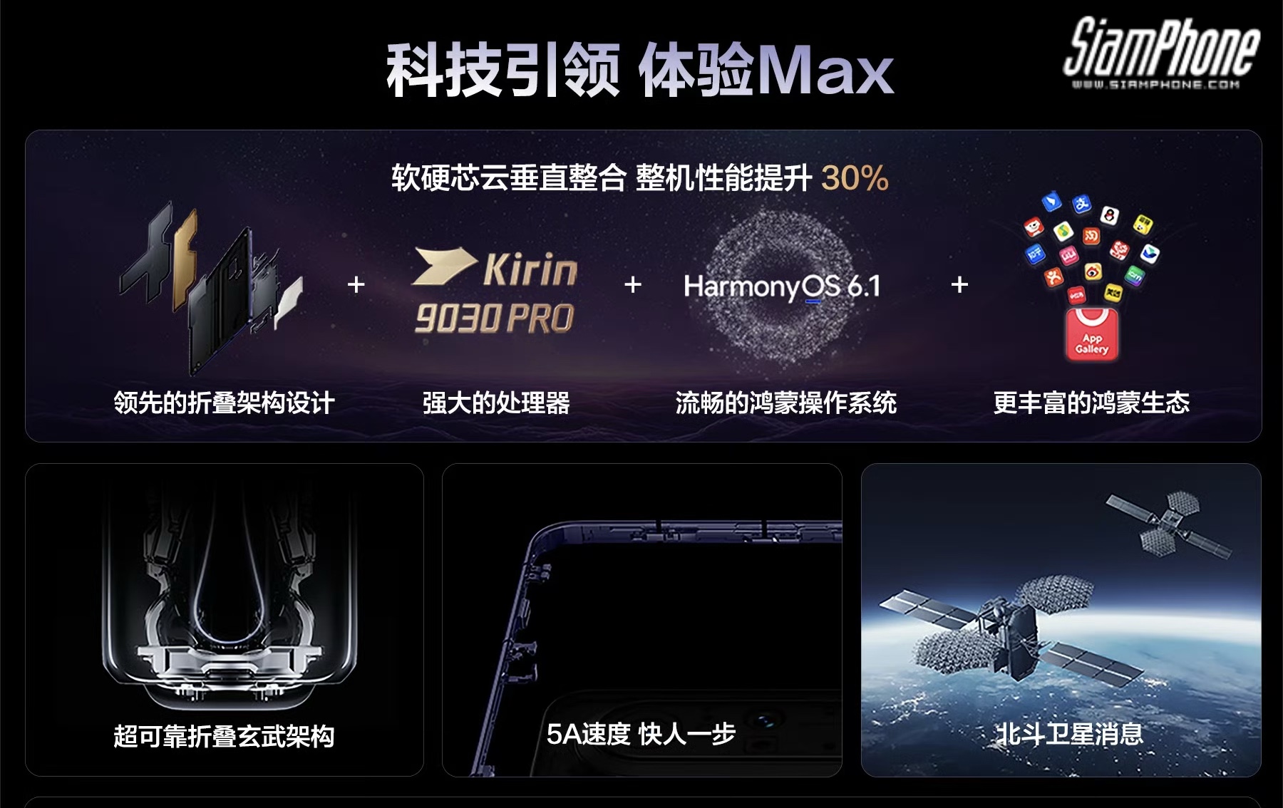 ในด้านประสิทธิภาพและความทนทาน Pura X Max ขับเคลื่อนด้วยขุมพลังชิปเซ็ต Kirin 9030 Pro ที่รองรับการประมวลผลกราฟิกแบบ Ray Tracing ขั้นสูง ตัวเครื่องได้รับการอัปเกรดโครงสร้างด้วยบานพับแบบหยดน้ำ "Basalt Waterdrop Hinge" รุ่นใหม่ ซึ่งช่วยเพิ่มพื้นที่หน้าจอและทนทานต่อการตกกระแทกได้ดีขึ้นถึง 33% นอกจากนี้ หน้าจอพับด้านในยังใช้วัสดุคอมโพสิตโครงสร้าง 3 ชั้น (รวมถึงกระจก UTG) ช่วยเพิ่มความทนทานต่อแรงกระแทกและแรงกดทับได้อย่างดีเยี่ยม ส่วนแบตเตอรี่ให้ความจุมาที่ 5,300mAh รองรับชาร์จไวแบบเสียบสาย 66W และไร้สาย 50W