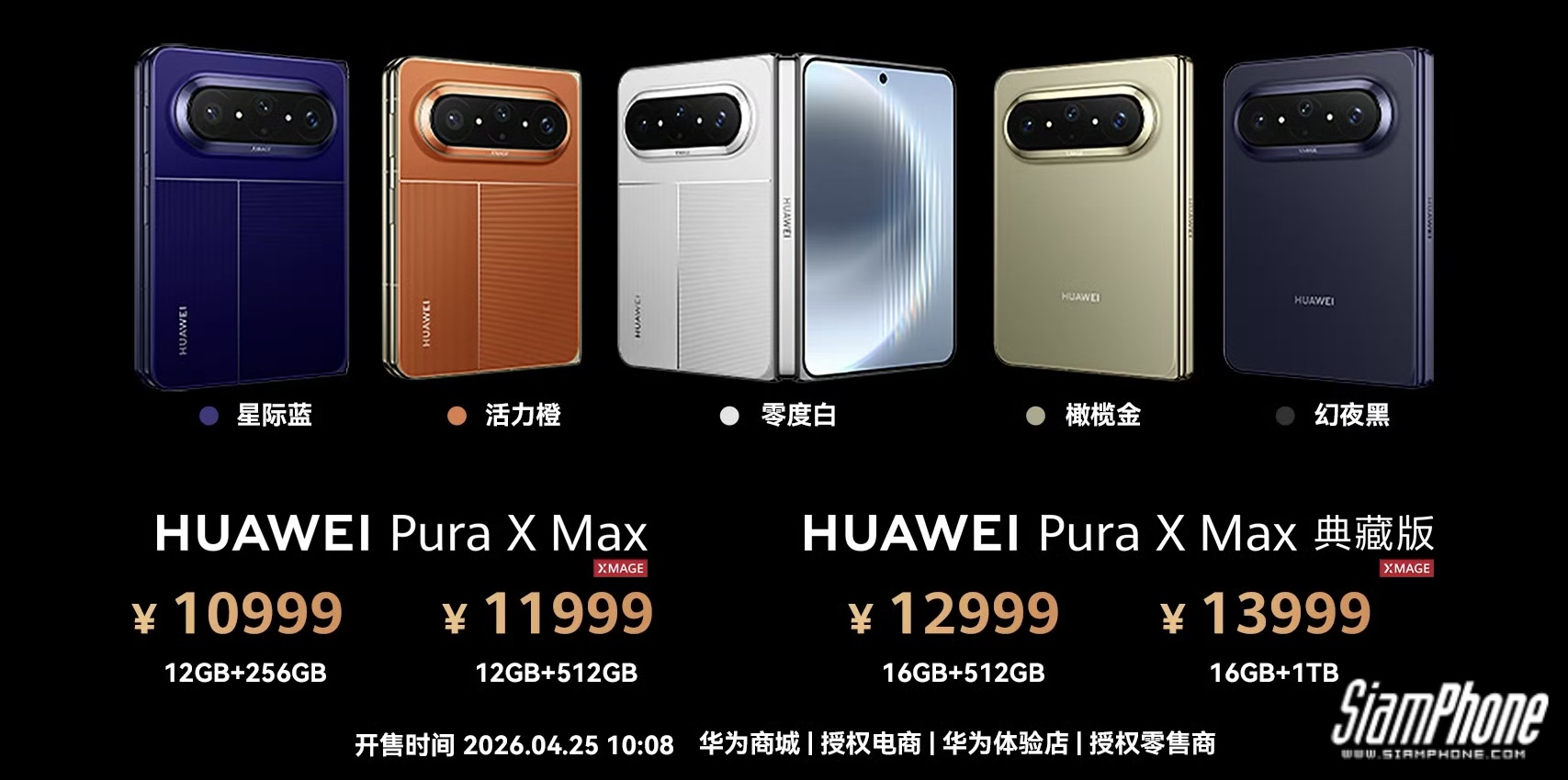 HUAWEI Pura X Max เปิดให้สั่งจองล่วงหน้าแล้ว และจะเริ่มวางจำหน่ายในประเทศจีนตั้งแต่วันที่ 25 เมษายนเป็นต้นไป โดยมีราคาเริ่มต้นอยู่ที่ 10,999 หยวน หรือประมาณ 51,5xx บาท สำหรับรุ่นความจุ 12GB+256GB และไล่ไปจนถึงรุ่นท็อปสุด Collector's Edition ความจุ 16GB+1TB ในราคา 13,999 หยวน หรือประมาณ 65,6xx บาท