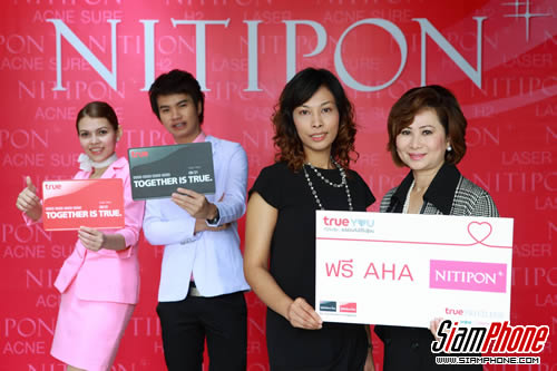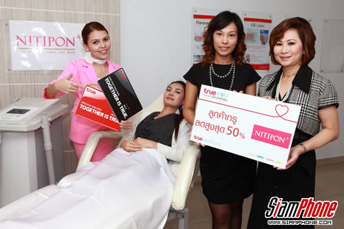 ทรู ยู โดย นางนันทิญา อังคณากานต์ รองผู้อำนวยการฝ่ายบริหารลูกค้าสัมพันธ์ บมจ.ทรู คอร์ปอเรชั่น และนางนิภา ภัทรภู่นาค รองกรรมการผู้จัดการบริษัท นิติพล คลินิก จำกัด ร่วมกันมอบสิทธิเศษให้กับลูกค้ากลุ่มทรูรับส่วนลดถึง 50% เมื่อใช้บริการ CS Laser โปรแกรมใหม่ล่าสุดที่มีประสิทธิภาพสูงในการปรับแก้ไขผิวหมอง คล้ำ ฝ้า กระ ช่วยให้ขาวขึ้นและกระชับรูขุมขน และส่วนลด 30% เมื่อใช้บริการทรีทเม้นต์และเลเซอร์กลุ่ม For Young + VL Laser พร้อมมอบความสุขยิ่งขึ้นสำหรับลูกค้าทรูการ์ด รับฟรีบริการ AHA 1 ครั้งในเดือนเกิด ลูกค้ากลุ่มทรู และทรูการ์ดรับสิทธิพิเศษได้แล้ววันนี้ – 31 ธันวาคม 2555 ที่นิติพลคลินิก 113 สาขาทั่วประเทศ