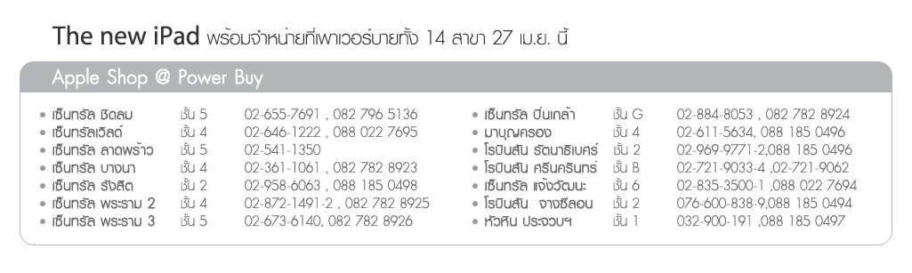 สัมผัสประสบการณ์ใหม่ไปพร้อมกับ The new iPad หน้าจอแสดงผล Retina Display หน่วยประมวลผล Dual Core Apple A5X และ กล้อง iSight ความละเอียด 5 ล้านพิกเซล ได้ที่พาวเวอร์บายทั้ง 14 สาขา ในวันที่ 27 เมษายน 2555