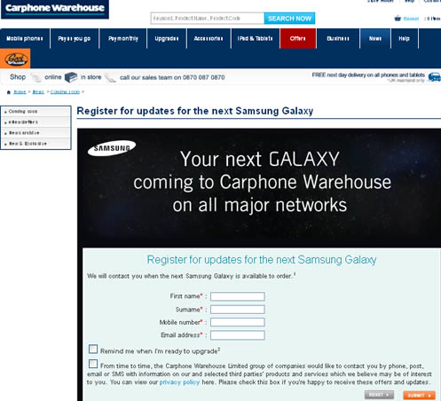 เร็วๆ นี้ที่ Carphone Warehouse ร้านขายปลีกมือถือรายใหญ่ในประเทศอังกฤษจะมีการสั่งจอง Samsung Galaxy S3 เช่นเดียวกัน โดยระบุรายการสินค้าที่จะมาเร็วๆ นี้ หนึ่งในนั้นคือ Samsung Galaxy S3 ที่ทุกคนรอคอยมายาวนานในวันที่ 3 พฤษภาคม