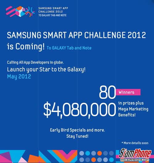 Samsung Smart App Challenge 2012 สุดยอดการแข่งขัน Mobile app ระดับโลกที่ยิ่งใหญ่ที่สุด โดยซัมซุงอิเล็กทรอนิกส์ ที่จะมีขึ้นในเดือนพฤษภาคมนี้ การแข่งขันนี้จัดขึ้นเพื่อเฟ้นหาสุดยอดผลงานที่โดดเด่นประเภทแอพพลิเคชั่นที่ใช้งานสำหรับ GALAXY Tab และ GALAXY Note