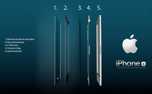 โดยนำกระจกที่มีความทนทานต่อกรดและด่างมาใช้กับหน้าจอที่มีึขนาด 4.3 นิ้ว ส่วนขอบตัวเครื่องใช้โครเมี่ยม ส่วนตัวเครื่อง iPhone Plus ใช้วัสดุประเภท Liquid Metal แทนกระจกป้องกันกัดกร่อน กันรอยขีดข่วน กล้องมีความละเอียด 10 ล้านพิกเซล พร้อมบันทึกวิดีโอความละเอียด Full HD 1080p มาพร้อมชิพ A6 หน่วยประมวลผล Quad-Core กับโปรเจ็กเตอร์ในตัวสำหรับการนำเสนองาน PowerPoint ในที่ประชุมของหน่วยงานองค์กร ส่วนในแนวคิด iPhone Plus นี้จะเกิดขึ้นจริงหรือไม่ต้องติมตามกันต่อไป