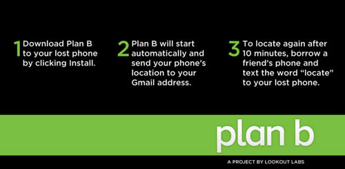 Plan B เป็นแอพพลิเคชั่นแอนดรอยด์สำหรับใช้ตามหาโทรศัพท์ (กรณีที่หาย ตกหล่น หรือมีคนเก็บได้) โดยผู้ใช้จะได้รับการแจ้งเตือนผ่านอีเมล์เพื่อบอกพิกัดตำแหน่งของโทรศัพท์ที่สูญหายด้วย GPS ผ่านทางแผนที่ (Google Maps) แอพพลิเคชั่นนี้พัฒนาโดยบริษัท Lookout เจ้าของแอพ Lookout Security แอนตี้ไวรัสที่ใช้ตามหาโทรศัพท์ได้เช่นกันแต่ต้องตั้งค่าเพิ่มเติมนั่นเอง ต่างกับแอพ Plan B ที่ผู้ใช้งานแค่ติดตั้งลงบนโทรศัพท์ของคุณ ก็สามารถใช้งานได้ทันที