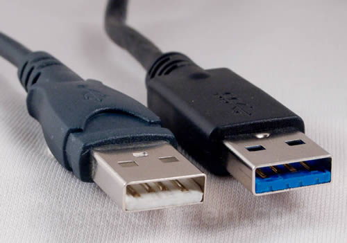 เปรียบเทียบ USB 2.0 (ซ้าย) และ USB 3.0 (ขวา)