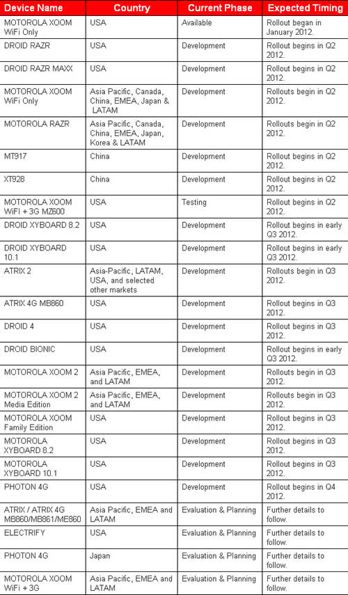 Motorola - ค่อนข้างเร็วในเรื่องของการส่งมอบอัพเดทให้กับทางผู้ใช้ ทั้งนี้เนื่องมาจากการเข้าซื้อกิจการของ Google นั่นเอง โดยผู้ผลิตก็ได้ประกาศรายชื่อสมาร์ทโฟนที่จะได้รับอัพเดทแอนดรอยด์ 4.0 ICS ออกมาแล้ว ซึ่งมีรายละเอียดและกำหนดการด้านล่างนี้ครับ