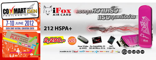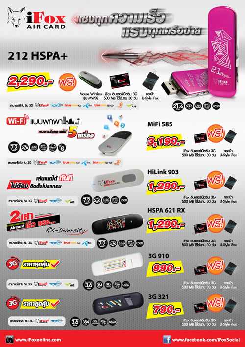 พบกับ iFox ผู้นำด้าน Air Card 3G แซงทุกความเร็ว...แรงทุกเครือข่าย ที่มาพร้อมกับโปรโมชั่นสุดพิเศษมากมาย เอาใจคนรักอินเตอร์เน็ต ด้วยความเร็วในการดาวน์โหลดสูงถึง 21.6 Mb. รองรับทุกเครือข่าย ทำให้การเล่นเน็ตของคุณไม่มีสะดุด