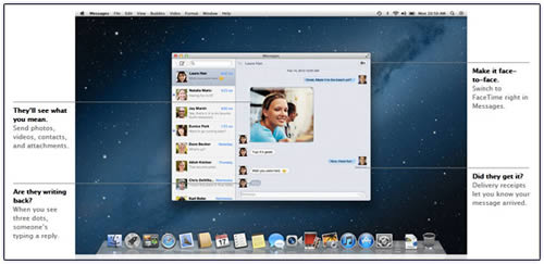 บน OS X Mountain Lion มีการผนวก iMessage, FaceTime และ iChat เข้ามาไว้ด้วยกันเพื่อลดความยุ่งยาก พร้อมทั้งปรับแต่ง interface ใหม่ที่ช่วยให้ผู้ใช้สามารถใช้งานได้ง่ายขึ้น และมี FaceTime ซ่อนอยู่ในหน้าต่างข้อความหลักหากต้องการสนทนาแบบเห็นหน้ากัน