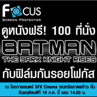 ฟิล์มกันรอยโฟกัส ชวนคุณร่วมปิดตำนาน แบทแมน อัศวินรัตติกาลผงาด (THE DARK KNIGHT RISES) ฟรีก่อนใคร 100 ที่นั่ง ที่ SFX Cinema เซ็นทรัล ลาดพร้าว วันที่ 19 กรกฎาคม 55 รอบ 14.00 น. ร่วมสนุกเพื่อรับตั๋วชมภาพยนตร์ได้ง่ายๆ เพียงคุณแชร์คลิปวีดีโอโฆษณา “โฟกัส ทัชแล้วใช่กับหนูนา หนึ่งธิดา โสภณ “ติดตามรายละเอียดและกติกาได้ที่ http://www.facebook.com/FocusFilm ตั้งแต่วันนี้ถึง 15 กรกฎาคม และประกาศรายชื่อผู้โชคดีทางแฟนเพจเฟสบุ๊คฟิล์มกันรอยโฟกัส 16 กรกฎาคมนี้