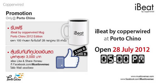 ทั้งนี้ บริษัท คอปเปอร์ไวร์ด จำกัด พร้อมเปิด ร้าน “iBeat by copperwired” สาขาพอร์โต้ ชิโน่ (Porto Chino) อย่างเป็นทางการในวันที่ 28 กรกฎาคมนี้ เวลา 17.00 น. และสำหรับลูกค้า 100 คนแรกที่เข้ามาในร้านจะได้รับแก้ว iStudio by copperwired @ Porto Chino ฟรี และสำหรับลูกค้าที่ คลิก like : www.facebook.com/Mustlovemac พร้อม Share ภาพกิจกรรมไปยังหน้า Wall ของตัวเองจะได้ Lucky Draw ลุ้นรับ Voucher มูลค่าสูงสุดถึง 3,000 บาท