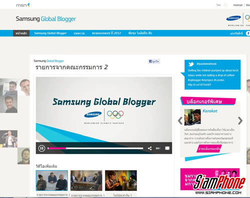 ร่วมส่งกำลังใจและแรงเชียร์ให้ 4 ตัวแทนประเทศไทยในโครงการ “ซัมซุง โกลบอล บล็อกเกอร์” ที่เหินฟ้ารายงานสดมหกรรมกีฬาแห่งมวลมนุษยชาติตรงจากลอนดอนผ่านโซเชียลเน็ตเวิร์ค ร่วมกับสุดยอดบล็อกเกอร์รวม 75 คนที่ผ่านการคัดเลือกจากทั่วโลก พร้อมสัมผัสประสบการณ์สุดยิ่งใหญ่กับครั้งหนึ่งในชีวิตในมหกรรมกีฬาโอลิมปิก 2012 ตั้งแต่วันนี้ – 12 สิงหาคมนี้ทาง www.samsungglobalblogger.com