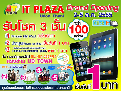 ไอที พลาซ่า ร่วมกับร้านค้าไอทีชั้นนำของเมืองไทยยกขบวนสินค้าไอทีจัดรายการพิเศษที่ศูนย์ฯไอทีพลาซ่า เนวาด้า คอมเพล็กซ์ ชั้น 1 (ตรงข้าม UD Town) อุดรธานี ให้ลูกค้าได้ช้อปซื้อสินค้าไอที โทรศัพท์มือถือ แล้วยังได้พบกับโปรโมชั่นสุดพิเศษจากร้านค้าชั้นนำ อาทิ Banana IT, J.I.B, Soft World, Advice, CSC, ABC Computer, V.G.L.,D-Tech, Big Camera ฯลฯ และลูกค้ายังมีสิทธิ์รับโชค 3 ชั้นภายในงานกับของรางวัลไม่ว่าจะเป็น iPhone4S หรือ The New iPad กว่า 100 เครื่อง โดยโชคชั้นที่1 ลุ้นรับ iPhone4S หรือ The New iPad ในครึ่งราคา โชคชั้นที่2 ประมูล iPhone4S หรือ The New iPad ในราคาเริ่มต้น 1 บาท และโชคชั้นที่3 เมื่อซื้อสินค้าภายในงาน เพียงนำใบเสร็จมาร่วมลุ้นรับสิทธิ์ซื้อของรางวัล อาทิ iPhone4S, The New iPad หรือ Sumsung Galaxy Pocket ในราคา 1 บาทเท่านั้น