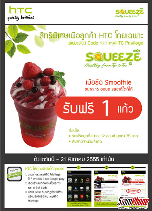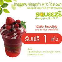 เอชทีซีใจดีขยายเวลาต่อเนื่องด้วยโปรโมชั่นสุดพิเศษเครื่องดื่มเพื่อสุขภาพตลอดเดือนสิงหาคมนี้ที่ร้าน Squeeze เพียงซื้อสมูทตี้ขนาด 16 ออนซ์ รสชาติใดก็ได้ รับไปเลยสมูทตี้ขนาด 12 ออนซ์ 1 แก้วฟรี!!! ด้วยขั้นตอนง่ายๆเพียงดาวน์โหลด myHTC privilege จาก Play store หรือ myHTC S พร้อมเลือกสิทธิประโยชน์ที่ต้องการใช้บริการ กด Get Code และแสดงรหัสที่ปรากฏหน้าร้านค้า เพียงเท่านี้ก็ได้รับสิทธิพิเศษเหนือใครตั้งแต่วันนี้ – 31 สิงหาคม 2555 ความพิเศษแบบนี้มีให้เฉพาะลูกค้าเอชทีซีเท่านั้น