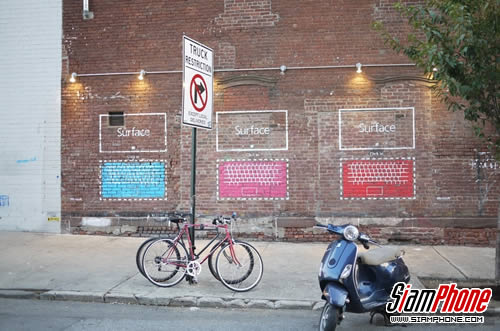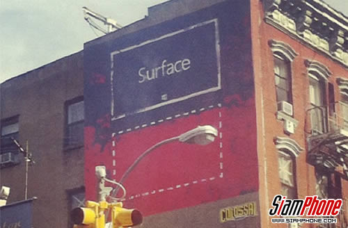 แม้ว่าขณะนี้ Microsoft Surface แท็บเล็ตตัวเก่งจะยังไม่ได้รับการเปิดตัวจนกว่าจะถึง 26 ตุลาคม แต่ทางบริษัท Microsoft ก็เผยว่าจะเริ่มส่งรุ่นที่รันบน Windows RT ลงตลาดก่อนจะส่งรุ่น Windows 8 ตามมาในภายหลัง ล่าสุดมีภาพเผยให้เห็นตึกและอาคารบางแห่งในมหานครนิวยอร์คถูกระบายสีภาพแท็บเล็ต Surface สามตัวด้วยกัน พร้อมกับคีย์บอร์ดสีฟ้า สีชมพู และสีแดง ที่มีลักษณะคล้ายกับ Microsoft Surface ของจริง