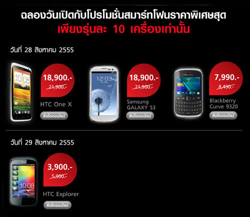 TrueStore ร้านค้าออนไลน์ "คลิกเดียวครบ สั่งครั้งเดียวคุ้ม วันเดียวได้ของทันใจ*" ฉลองวันเปิดกับโปรโมชั่นสมาร์ทโฟนราคาสุดพิเศษ เพียงรุ่นละ 10 เครื่องเท่านั้น อาทิ HTC One X ในราคา 18,900 บาท, Samsung Galaxy S3 ราคา 18,900 บาท