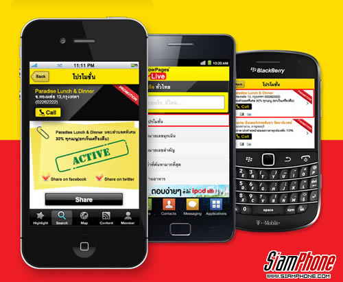 YellowPages Live Application รองรับสมาร์ทโฟนทุกแพลตฟอร์ม เปิดให้ดาวน์โหลดฟรีแล้ววันนี้ โปรแกรมค้นหาข้อมูลสินค้า บริการ และโปรโมชั่นต่างๆของร้านค้าที่อยู่ในฐานข้อมูลเยลโลเพจเจส ซึ่งรองรับสมาร์ทโฟนทุกแพลตฟอร์ม ไม่ว่าจะเป็น iPhone, Android, BlackBerry, Windows Phone และ J2ME นอกจากนี้ยังรองรับการทำงานบนแท็บเล็ตอีกด้วย