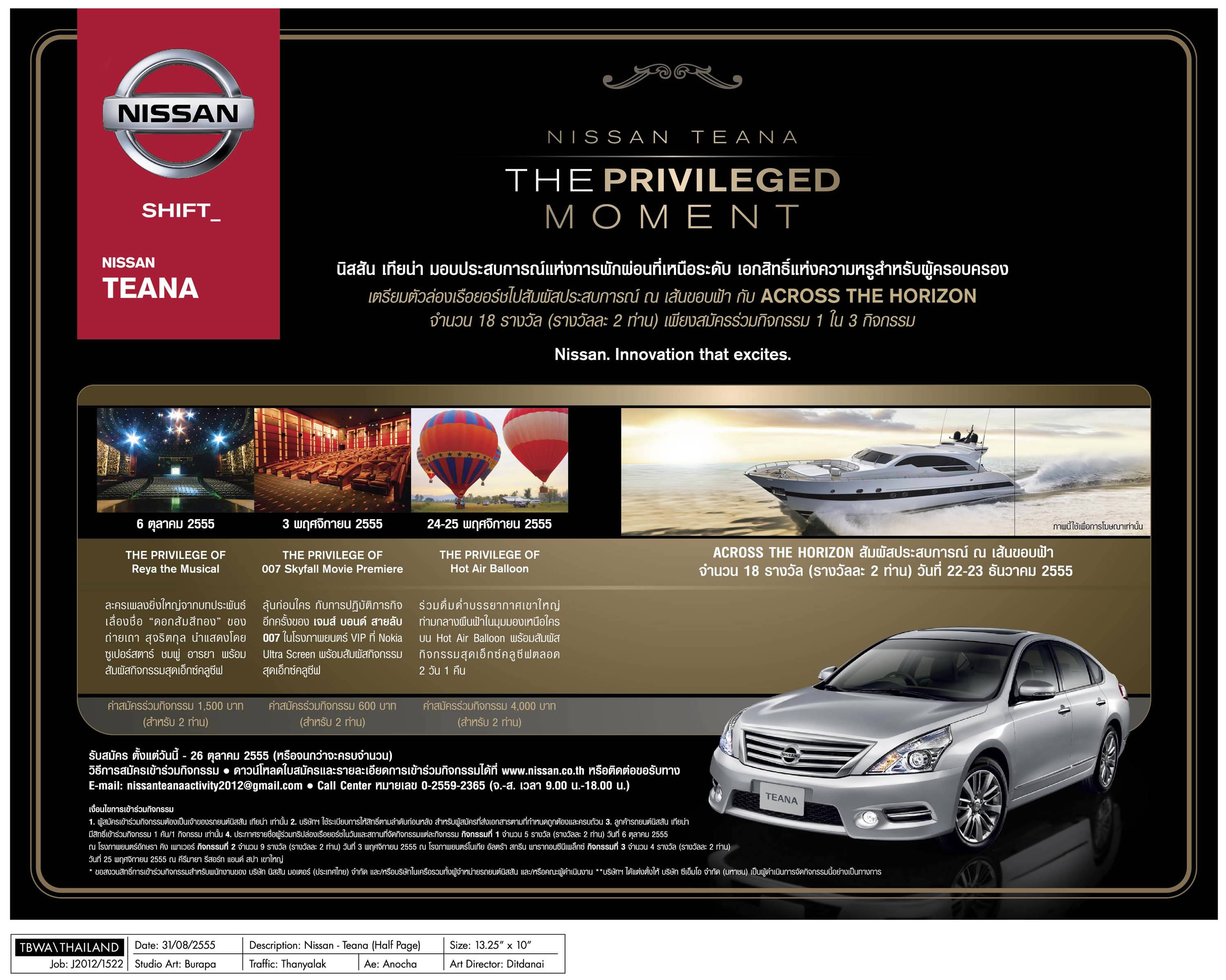 บริษัท นิสสัน (ประเทศไทย) จำกัด ประกาศจัดกิจกรรม The Privileged Moment เพื่อตอบแทนลูกค้านิสสัน เทียน่า ที่ให้ความไว้วางใจในผลิตภัณฑ์ พร้อมเปิดรับสมัครลูกค้าที่เป็นเจ้าของนิสสัน เทียน่า เพื่อเข้าร่วมสัมผัสประสบการณ์เหนือระดับ อันสะท้อนถึงภาพลักษณ์การใช้ชีวิตของผู้ครอบครองรถยนต์ระดับหรู ผ่าน 3 กิจกรรมเอ็กซ์คลูซีพ อันได้แก่