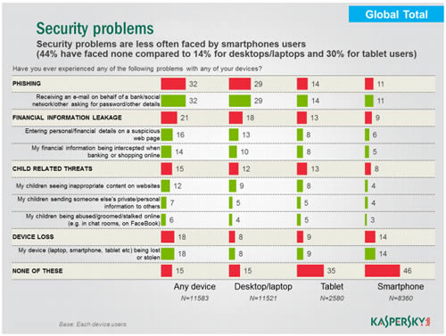ผู้ใช้อินเทอร์เน็ตส่วนมากมักตกเป็นเหยื่อของฟิชชิ่งผ่านทางอุปกรณ์สื่อสารแบบไร้สาย กล่าวคือ 24% ของผู้ใช้แท็บเล็ตและ 18% ของผู้ใช้สมาร์ทโฟนเคยได้รับข้อความที่มีลิ้งค์หรือไฟล์แนบแปลกๆ 14% และ 11% ตามลำดับเคยได้รับจดหมายที่อ้างว่ามาจากธนาคารหรือโซเชียลเน็ตเวิร์ก และในขณะที่อุปกรณ์ไร้สายต่างรองรับและได้รับความนิยมจากการสื่อสารออนไลน์มากยิ่งขึ้นทุกวันนั้น ปริมาณข้อความฟิชชิ่งสำหรับโมบายล์แพลตฟอร์มก็จะทวีจำนวนขึ้นด้วย ดังนั้น ถึงเวลาแล้วหรือยังที่คุณควรพิจารณาเรื่องระบบป้องกันความปลอดภัยให้แก่อุปกรณ์สื่อสารไร้สายด้วยโซลูชั่นที่มีฟังก์ชั่นแอนตี้ฟิชชิ่งโดยเฉพาะ