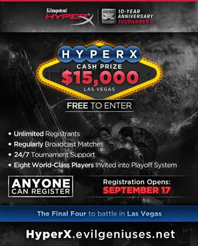 เกมเมอร์สจากทั่วโลกจะมีโอกาสได้เข้าร่วมแข่นขันออนไลน์ เพื่อค้นหาผู้เข้ารอบชิงชนะเลิศ โดยตัดสินกับแบบตัวต่อตัวที่ลาส เวกัส เนวาดา ในช่วงงาน International CES 2013 ซึ่งจะจัดในเดือนมกราคมปี 2013 โดยเชิญโปรเกมเมอร์ส 8 คน มาประลองฝีมือกับผู้เล่นออนไลน์ที่ผ่านการคัดเลือก ซึ่งเป็นการวมตัวของเผ่าพันธุ์ในเกมส์นี้มากถึง 16 คน ทั้งนี้เพื่อชิงตำแหน่ง HyperX Champion เพื่อคว้ารางวัลชนะเลิศถึงสี่รางวัล รวมมูลค่ากว่า 15,000 ดอลลาร์สหรัฐฯ