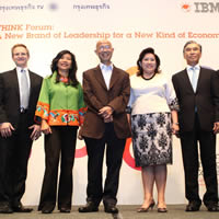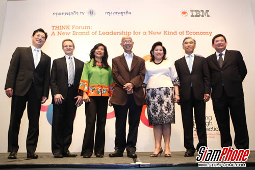 นางพรรณสิรี อมาตยกุล กรรมการผู้จัดการใหญ่ บริษัท ไอบีเอ็ม ประเทศไทย จำกัด (ที่ 3 จากขวา) พร้อมด้วย มิสเกรซ โชพาร์ด Vice President and Partner, Strategy & Transformation Leader, IBM Global Business Services, Growth Market จัดงานสัมนา THINK Forum เผยผลสำรวจ CEO Study 2012 และเสวนา “A new Brand of Leadership for a New Kind of Economy” โดยมีผู้ร่วมเสวนา คุณบุญทักษ์ หวังเจริญ ประธานเจ้าหน้าที่บริหาร ธนาคารทหารไทย จำกัด (มหาชน) (ซ้ายสุด) คุณอิสระ ว่องกุศลกิจ ประธานกรรมการกลุ่มมิตรผล (ที่ 2 จากขวา) คุณสุทธิชัย หยุ่น ประธานกรรมการ บริษัท เนชั่นมัลติมีเดีย กรุ๊ป จำกัด (มหาชน)(ที่ 4 จากขวา) ดร.สุวิทย์ เมษิณทรีย์ ผู้อำนวยการ Sasin Institute for Global Affairs (ขวาสุด)