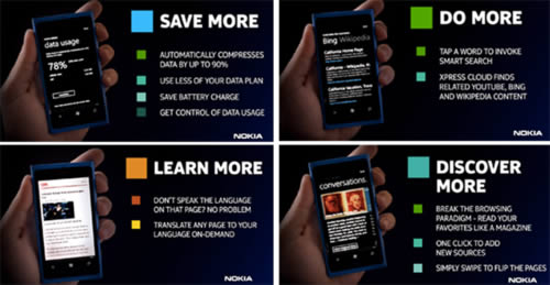 Nokia ได้นำเสนอเบราว์เซอร์ดังกล่าวโดยชูจุดเด่นที่เป็นมากกว่าเบราว์เซอร์ทั่วไปและแพลตฟอร์มอินเทอร์เน็ตในรูปแบบบริการคลาวด์ (cloud-based internet platform) โดยเบราว์เซอร์ Xpress สามารถบีบอัดข้อมูลได้ถึง 85% จึงเหมาะสำหรับผู้ที่ใช้งานแพคเกจดาต้าแบบจำกัดจำนวนการใช้งาน นอกจากนั้นยังมีคุณสมบัติอื่นๆ ที่มีประโยชน์อีก ได้แก่ การตรวจสอบการใช้งานข้อมูล, การบันทึกข้อมูลเว็บเพจไปเก็บไว้ที่ SkyDrive, การแปลภาษาด้วยการคลิกเพียงครั้งเดียว, การจัดการเลย์เอ้าท์เค้าโครงคล้ายกับแมกกาซีนที่ง่ายต่อการใช้งาน ซึ่งทั้งหมดนี้จะช่วยให้ผู้ใช้สามารถท่องเว็บไซต์ได้อย่างสมบูรณ์แบบตามต้องการ