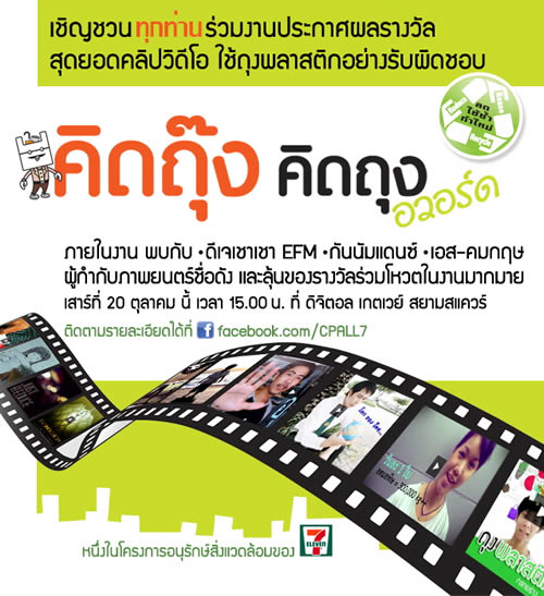 เข้าสู่โค้งสุดท้ายของโครงการ "คิดถุ๊ง คิดถุง อวอร์ด" ประกวดคลิปรณรงค์ใช้ถุงพลาสติกอย่างมีความรับผิดชอบ ปิยะวัฒน์ ฐิตะสัทธาวรกุล กรรมการผู้จัดการ บริษัท ซีพี ออลล์ จำกัด (มหาชน) พบปะใครในช่วงนี้ต้องชวนให้เข้าไปโหวตให้กับ 24 ทีมเยาวชนฝีมือดี ที่ผ่านเข้ารอบในเว็บ www.kidtoong.com เพื่อร่วมแสดงพลังรักษ์สิ่งแวดล้อม ส่วนงานประกาศผลที่เตรียมจะจัดขึ้นในวันเสาร์ที่ 20 ตุลาคมนี้ ณ ดิจิตอล เกตเวย์ สยามสแควร์ ชิงเงินรางวัลกว่า 2 แสนบาท แถมยังเตรียมของรางวัลพิเศษให้กับวัยรุ่นแถวๆ สยามสแควร์ที่มาร่วมโหวตให้กับ 7 ทีมสุดท้ายอีกด้วย เรียกว่าอัดฉีดกันขนาดนั้น เพราะว่าโลกร้อนเป็นเรื่องของทุกๆ คนที่ต้องช่วยกันด้วยวิธีง่ายๆ คือ ช่วยกันลดใช้ถุงพลาสติกนั่นเอง