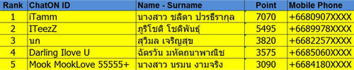 ประกาศรายชื่อ 5 สุดยอดนักแชท ChatON (รางวัล Samsung Galaxy S III จำนวน 5 รางวัล) ขอแแสดงความยินดียินดีกับผู้โชคดีทั้ง 5 ท่าน สำหรับผู้ที่พลาดโอกาสในครั้งนี้ ไว้มาร่วมสนุกกันใหม่เร็วๆ นี้