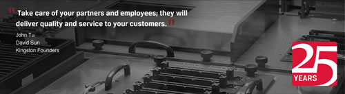 จอห์น ตู้ (John Tu) ซีอีโอและผู้ร่วมก่อตั้งคิงส์ตันกล่าวว่า “ผมรู้สึกอิ่มเอิบใจมากทีได้เป็นส่วนหนึ่งของบริษัทนี้ สิ่งที่ดีที่สุดของกาลเวลาที่ล่วงเลยมาถึง 25 ปี คือ ผู้คนที่ทำงานที่นี่ พันธมิตรทางธุรกิจ และความสัมพันธ์หลากหลายรูปแบบที่เราได้เข้าไปมีส่วนร่วม ผมปะหลาดใจเหลือเกินเวลานึกย้อนไปถึงจุดเริ่มต้นของธุรกิจจนถึงจุดที่เรายืนอยู่ในปัจจุบัน และผมยังมองยาวไปสู่อนาคตของเราในอีก 25 ปีข้างหน้าอีกด้วย”