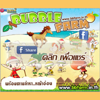 Bubble Farm กับสโลแกนแนวๆ ที่ว่า "ตามล่าหาหญ้าอ่อน" เกมปลูกผักบน Facebook ที่ใช้ไอดี Facebook เล่นได้เลย เปิดให้เพื่อนๆ ได้ร่วมสนุกกันก่อนที่เกมจะเปิด Close Beta ในวันที่ 1 พฤศจิกายนนี้ กับระบบใหม่ของ Bubble Farm นั่นก็คือ ระบบแชร์ข่าว ง่ายๆ เพียงคุณมี Facebook เป็นของตัวเอง และกดแชร์ข่าวลงที่ Wall ของตัวเอง สะสมยอดแชร์ไปเรื่อยๆ เมื่อครบตามที่กำหนดก็จะได้รับไอเทมกันไปฟรีๆ ทันที แต่ต้องระวังนิด เพราะจะต้องแชร์ผ่านหน้าข่าวทางหน้าเว็บ www.bbfarm.in.th เท่านั้นนะค่ะ จึงจะมีสิทธิ์ร่วมสนุกลุ้นรับของรางวัลนะจ๊ะ