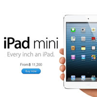 หลังจากที่ Apple เปิดตัว iPad mini แท็บเล็ตย่อส่วนจาก iPad ที่มาพร้อมหน้าจอแสดงผลขนาด 7.9 นิ้ว บนระบบปฏิบัติการ iOS6 ที่มีมาให้เลือกถึง 6 รุ่น ทั้งรุ่นที่สามารถรองรับการใช้งาน Wi-Fi และรุ่นที่รองรับการใช้งานบนสัญญาณเครือข่าย ในตัวเครื่องสีดำ และสีขาว ซึ่งได้มีการเปิดให้ Pre-Order ในต่างประเทศกันไปก่อนหน้านี้ ล่าสุด Apple Store ไทยก็ไม่น้อยหน้า เปิดให้สามารถสั่งซื้อ iPad mini ผ่านทางเว็บไซต์ www.apple.com/th ทั้ง 6 รุ่น ในราคาเริ่มต้นที่ 11,200 บาท โดยทั้ง 6 รุ่นยังอยู่ในขั้นตอนยื่นขออนุมัติ ซึ่งมีรายละเอียดการจัดส่งภายใน 2 อาทิตย์สำหรับรุ่นรองรับ WiFi และหากเป็นรุ่นรองรับสัญญาณเครือข่ายยังไม่มีกำหนดการจัดส่ง