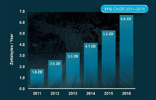 การขยายตัวของทราฟฟิกดาต้าเซ็นเตอร์ทั่วโลกจะเพิ่มขึ้น 4 เท่าภายในปี 2559 ซิสโก้คาดการณ์ว่าทราฟฟิกดาต้าเซ็นเตอร์ทั่วโลกจะเติบโตเกือบ 4 เท่า จาก 1.8 เซตตาไบต์ในปี 2554 เพิ่มเป็น 6.6 เซตตาไบต์ต่อปีในปี 2559 หรือคิดเป็นอัตราเติบโตเฉลี่ย 31 เปอร์เซ็นต์ต่อปี