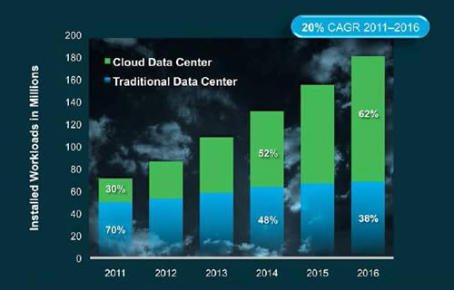 การเปลี่ยนย้ายเวิร์กโหลด (Workload Transition): ในช่วงปี 2554 ถึง 2559 เวิร์กโหลดดาต้าเซ็นเตอร์จะเพิ่มขึ้น 2.5 เท่า ขณะที่เวิร์กโหลดคลาวด์จะเพิ่มขึ้น 5.3 เท่า ในปี 2554 เวิร์กโหลด 30 เปอร์เซ็นต์ถูกประมวลผลในระบบคลาวด์ ขณะที่ 70 เปอร์เซ็นต์ถูกจัดการในดาต้าเซ็นเตอร์แบบเก่า
