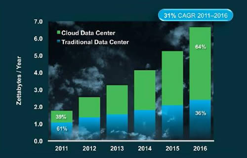 รายงาน Cisco Global Cloud Index (ปี 2554-2559) ฉบับที่สองของปีนี้คาดการณ์ว่า ‘ทราฟฟิกของดาต้าเซ็นเตอร์ทั่วโลก’ (ข้อมูลที่มีการใช้งานบนดาต้าเซ็นเตอร์ทั่วโลก) จะเพิ่มขึ้น 4 เท่าจนแตะระดับ 6.6 เซตตาไบต์ต่อปีภายในปี 2559 นอกจากนี้ บริษัทฯ ยังคาดการณ์ว่า ‘ทราฟฟิกคลาวด์ทั่วโลก’ (ข้อมูลที่มีการใช้งานบนคลาวด์ทั่วโลก) ซึ่งเป็นส่วนหนึ่งที่เติบโตเร็วที่สุดของทราฟฟิกดาต้าเซ็นเตอร์ จะเพิ่มขึ้น 6 เท่า ในปี 2559 หรือเติบโตในอัตราเฉลี่ย 44 เปอร์เซ็นต์ต่อปี และปริมาณทราฟฟิก 683 เอ็กซาไบต์ต่อปีในช่วงปี 2554 จะเพิ่มเป็น 4.3 เซตตาไบต์ภายในปี 2559
